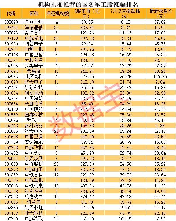 機構關注度較高的國防軍工股并不多,近半數個股評級機構數在兩家以下。中直股份(行情600038,診股)、中航沈飛、中航光電(行情002179,診股)、航天電器(行情002025,診股)、海格通信(行情002465,診股)等個股評級機構數最多,均在20家以上,中航機電(行情002013,診股)、中航高科(行情600862,診股)、中航電子(行情600372,診股)等個股均有10多家機構評級。5家以上機構評級的個股中,有23只個股跑輸行業指數,星網宇達(行情002829,診股)和海格通信7月以來漲幅均不足10%,海特高新(行情002023,診股)、中航光電、四創電子(行情600990,診股)等8股漲幅不足20%。
