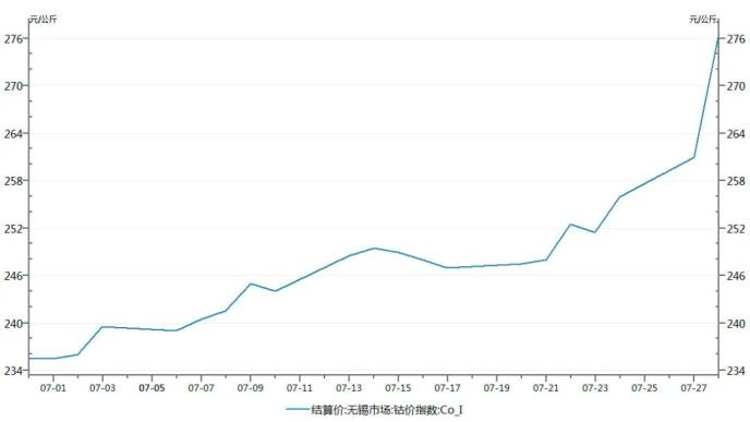 生意社7月28日數(shù)據(jù)顯示,電池級(jí)硫酸鈷報(bào)價(jià)為5.5萬(wàn)元/噸,較月初價(jià)格上漲10%;國(guó)產(chǎn)四氧化三鈷、氯化鈷報(bào)價(jià)分別為18.05萬(wàn)元/噸、5.85萬(wàn)元/噸,較月初價(jià)格分別上漲3%、5%。