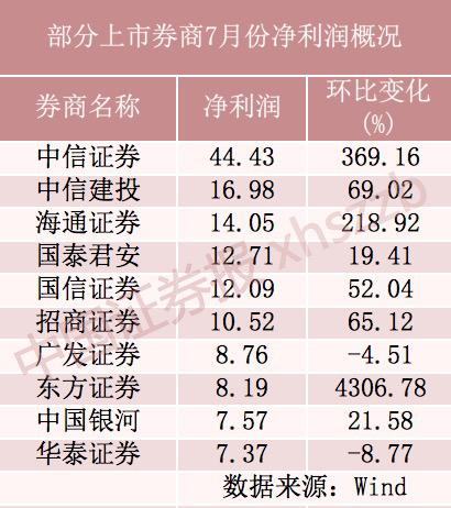 緊隨其后的是海通證券,7月實現凈利潤14.05億元,環比上升超過200%。此外,單月凈利潤超過10億元的還有國泰君安、國信證券和招商證券。