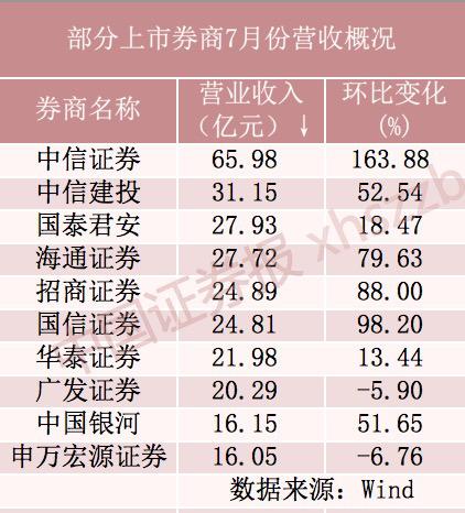 從營收看,35家上市券商7月份合計實現營收429.71億元,有13家上市券商營收超10億元。