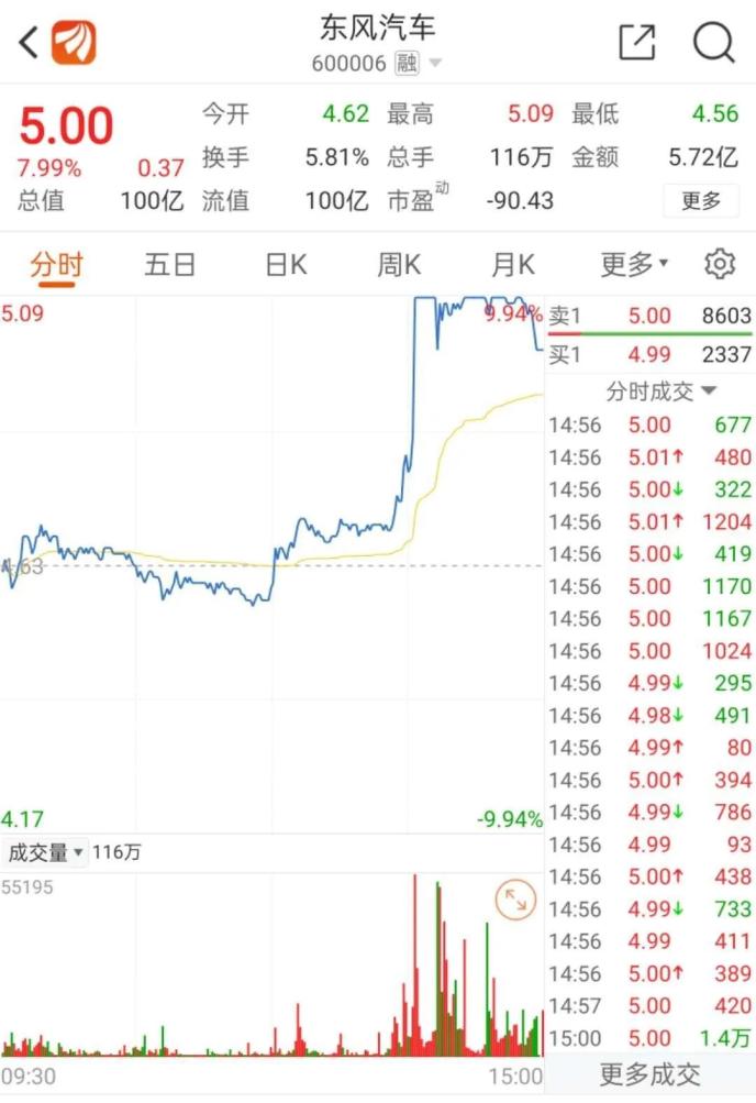 8月11日下午,東風(fēng)汽車集團(tuán)有限公司旗下的東風(fēng)汽車、東風(fēng)科技(行情600081,診股)一度漲停。截至下午收盤(pán),東風(fēng)汽車漲7.99%,東風(fēng)科技漲2.55%。