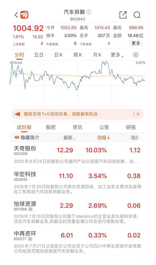 8月13日,汽車拆解概念股集體異動(dòng),天奇股份(行情002009,診股)(維權(quán))(002009)漲停,報(bào)收12.29元/股,華宏科技(行情002645,診股)、怡球資源(行情601388,診股)(維權(quán))(601388)等跟漲。