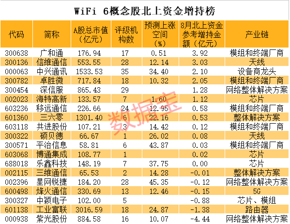 谷歌測試WIFI6,車與車之間可以溝通,也可用于5G蜂窩網絡,可防止“網絡擁擠”。預計如手機、平板、電視、路由器等相關常用設備于2021年-2022年可支持使用,如華為、三星、小米等,WIFI6相關概念股8月以來北上資金增持超億元,共33支。