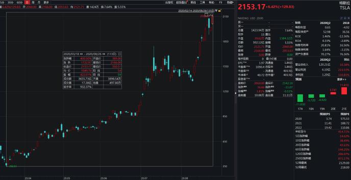 特斯拉從3月低位一路上漲,100多個(gè)交易日股價(jià)漲幅超400%。最新收盤價(jià)為2153.17美元,總市值為4013億美元。