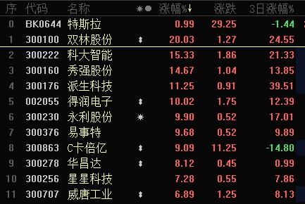 今日早盤,特斯拉概念股全線大漲。雙林股份(行情300100,診股)早早封死漲停,科大智能(行情300222,診股)、秀強(qiáng)股份(行情300160,診股)(維權(quán))、派生科技(行情300176,診股)、得潤電子(行情002055,診股)等均張超10%。