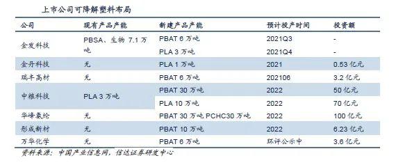 據(jù)華安證券統(tǒng)計(jì),目前已有36家公司有在建或擬建的可降解塑料項(xiàng)目,新增產(chǎn)能合計(jì)440.5 萬噸,是現(xiàn)有產(chǎn)能的7倍。以下表格是部分上市公司對(duì)可降解塑料產(chǎn)能的布局情況: