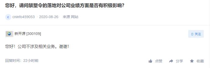 8月31日,新開源(行情300109,診股)回復(fù)投資者提問稱,“禁塑令”落地對(duì)公司業(yè)績(jī)無影響,公司不涉及相關(guān)業(yè)務(wù)。