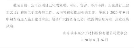 8月25日晚間,瑞豐高材(行情300243,診股)公告,8月24日,公司收到淄博市生態(tài)環(huán)境局出具的審批意見,同意年產(chǎn)6萬噸生物可降解高分子材料PBAT項(xiàng)目,按申報(bào)工藝、規(guī)模、地點(diǎn)和污染防治措施等進(jìn)行建設(shè)。瑞豐高材表示,公司將積極推進(jìn)相關(guān)工作,爭(zhēng)取于2020年9月中旬左右進(jìn)入施工建設(shè)階段。