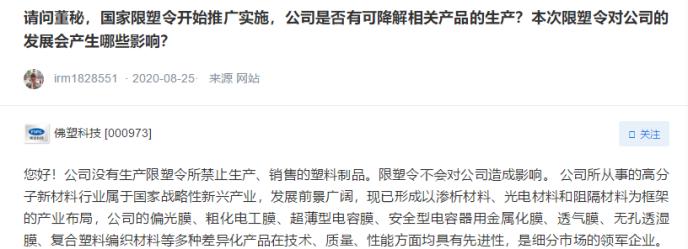 佛塑科技(行情000973,診股)也回復(fù)投資者稱,公司沒有生產(chǎn)限塑令所禁止生產(chǎn)、銷售的塑料制品。限塑令不會(huì)對(duì)公司造成影響。