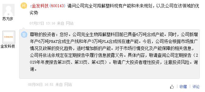 金發(fā)科技在互動(dòng)平臺(tái)表示,公司完全生物降解塑料目前已具備6萬噸合成產(chǎn)能,公司將會(huì)根據(jù)市場(chǎng)推廣情況及政策的變化趨勢(shì),適時(shí)增加新的產(chǎn)能。