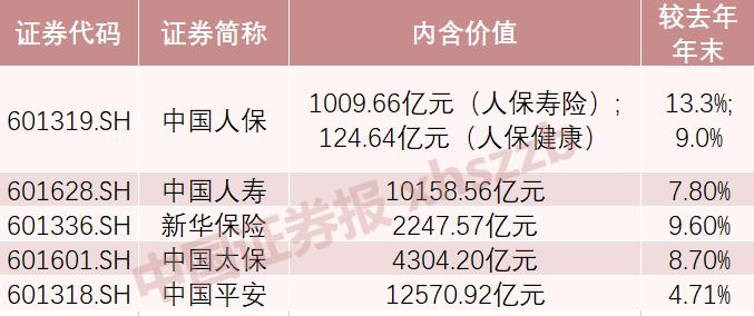衡量保險股潛力的另一大指標(biāo)——內(nèi)含價值方面,五大險企均實現(xiàn)增長。截至上半年末,中國人壽內(nèi)含價值首次超過萬億元大關(guān),達(dá)10158.56億元,較上年末增長7.8%。新華保險(行情601336,診股)內(nèi)含價值達(dá)到2247.57億元,較上年末增長9.6%。中國太保內(nèi)含價值4304.20億元,較上年末增長8.7%。人保壽險內(nèi)含價值1009.66億元,較上年末增長13.3%,人保健康內(nèi)含價值124.64億元,較上年末增長9.0%。中國平安集團(tuán)內(nèi)含價值12570.92億元,較上年末增長4.71%。