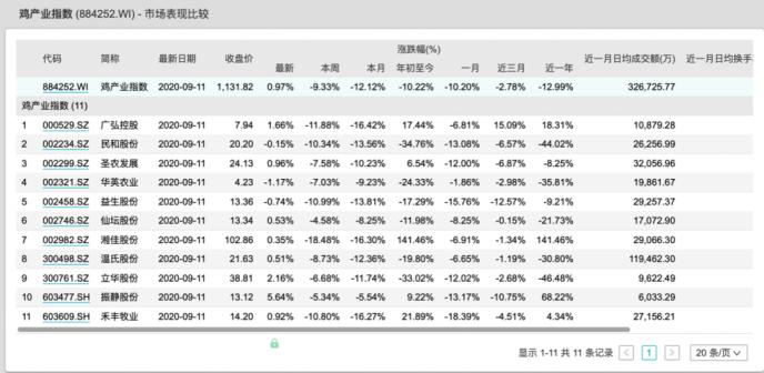 Wind數(shù)據(jù)顯示,雞產(chǎn)業(yè)指數(shù)上周(9月7日-9月11日)累計下跌9.33%,本月累計下跌12.12%,年初至今跌逾10%。