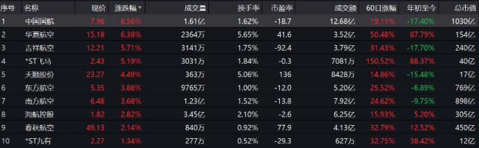周二,華夏航空(行情002928,診股)、吉祥航空(行情603885,診股)、東方航空(行情600115,診股)、南方航空(行情600029,診股)分別上漲6.38%、5.71%、3.88%、3.68%。