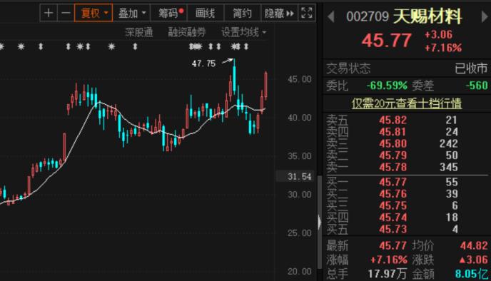 擁有鋰離子電池材料板塊的天賜材料(行情002709,診股),具有配套布局電解液和磷酸鐵鋰的關鍵原料生產能力,包括六氟磷酸鋰。 在與多氟多一樣在9月初出現快速上行后,天賜材料近日股價也上行明顯。9月15日,該公司股價報收45.77元/股,單日漲幅7.16%,近三個交易日累計漲幅超過17%。