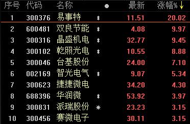 晶盛機電、民德電子(行情300656,診股)、豫金剛石(行情300064,診股)、康強電子(行情002119,診股)、北方華創(行情002371,診股)、和而泰(行情002402,診股)、海能實業(行情300787,診股)、楚江新材、賽微電子(行情300456,診股)、華天科技(行情002185,診股)、洲明科技(行情300232,診股)、岱勒新材(行情300700,診股)、江豐電子(行情300666,診股)、南大光電(行情300346,診股)、柘中股份(行情002346,診股)、捷捷微電(行情300623,診股)、鋅業股份(行情000751,診股)、海特高新(行情002023,診股)、華燦光電(行情300323,診股)、兆馳股份(行情002429,診股)、天箭科技(行情002977,診股)、派瑞股份(行情300831,診股)、必創科技(行情300667,診股)、富滿電子(行情300671,診股)、光莆股份(行情300632,診股)、安泰科技(行情000969,診股)、奧海科技(行情002993,診股)、歐陸通(行情300870,診股)、大族激光(行情002008,診股)、藍海華騰(行情300484,診股)、新萊應材(行情300260,診股)料、振華科技(行情000733,診股)、易事特、三安光電(行情600703,診股)、國星光電(行情002449,診股)、英唐智控(行情300131,診股)、露笑科技、揚杰科技(行情300373,診股)、臺基股份、雙良節能、智光電氣(行情002169,診股)、華潤微(行情688396,診股)、華微電子(行情600360,診股)、聞泰科技(行情600745,診股)、亞光科技(行情300123,診股)。
