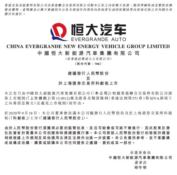 9月18日早間,恒大汽車(chē)發(fā)布公告稱(chēng),公司董事會(huì)決議擬發(fā)行人民幣股份,并于上海證券交易所科創(chuàng)板上市。