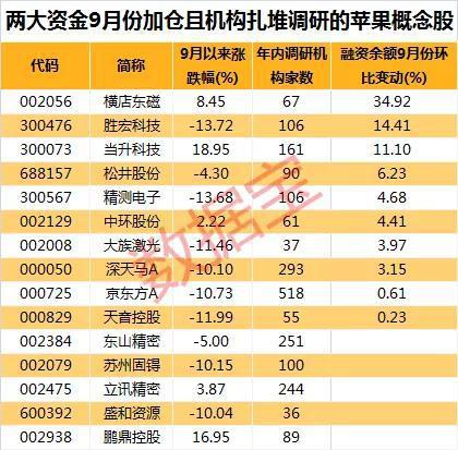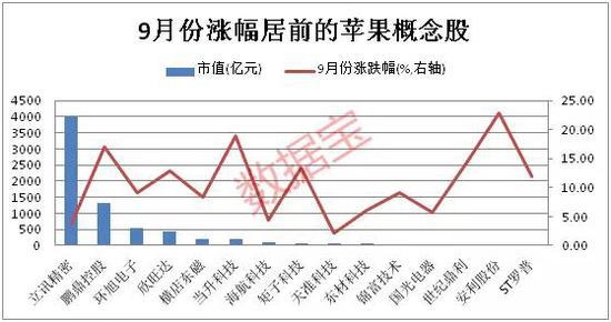 從市場表現來看,9月份以來,90只蘋果概念股平均跌幅超過了同期上證指數,跑贏大盤股不到30只,19股逆勢上漲,海目星(行情688559,診股)、歐菲光(行情002456,診股)、經緯輝開(行情300120,診股)等4股跌幅超過20%。