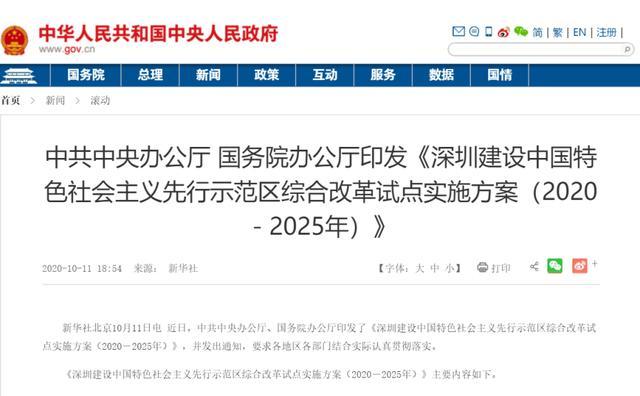 10月11日,中共中央辦公廳、國務院辦公廳印發(fā)了《深圳建設中國特色社會主義先行示范區(qū)綜合改革試點實施方案(2020-2025年)》,以設立經(jīng)濟特區(qū)40周年為契機,在中央改革頂層設計和戰(zhàn)略部署下,支持深圳實施綜合授權改革試點,是新時代推動深圳改革開放再出發(fā)的又一重大舉措,是建設中國特色社會主義先行示范區(qū)的關鍵一招,也是創(chuàng)新改革方式方法的全新探索。