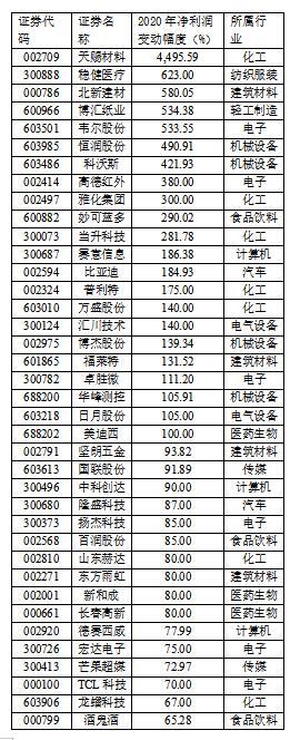 天賜材料(行情002709,診股)預(yù)計(jì)2020年凈利潤(rùn)同比增長(zhǎng)3882.84%至4495.59%(為6.5億元至7.5億萬元)最高。二級(jí)市場(chǎng)上,天賜材料股價(jià)在1月5日創(chuàng)出118.85元的歷史新高后雖有波動(dòng),但其2021年以來累計(jì)漲幅仍達(dá)5.97%。此外,穩(wěn)健醫(yī)療(行情300888,診股)、北新建材(行情000786,診股)、博匯紙業(yè)(行情600966,診股)、韋爾股份(行情603501,診股)、恒潤(rùn)股份(行情603985,診股)、科沃斯(行情603486,診股)、高德紅外(行情002414,診股)、雅化集團(tuán)(行情002497,診股)、妙可藍(lán)多(行情600882,診股)、當(dāng)升科技(行情300073,診股)、賽意信息(行情300687,診股)、比亞迪(行情002594,診股)等21家創(chuàng)歷史新高的公司預(yù)計(jì)2020年實(shí)現(xiàn)凈利潤(rùn)增長(zhǎng)幅度也可能超過100%。