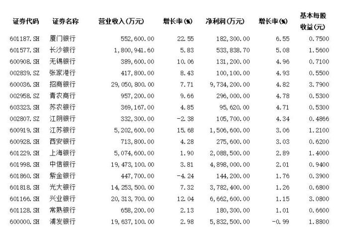 值得一提的是招商銀行(行情600036,診股)和興業(yè)銀行的營收均超過2000億元,招商銀行以營收2905.08億元和凈利潤973.42億元暫居榜首,中信銀行(行情601998,診股)和光大銀行(行情601818,診股)的營收也成功突破千億大關(guān)。招商銀行、中信銀行、光大銀行、興業(yè)銀行和上海銀行(行情601229,診股)這5家銀行去年第三季度的凈利潤均為負增長,這使得市場對這份業(yè)績快報有著超乎預(yù)期的感覺。