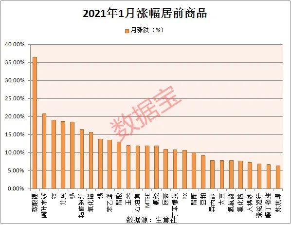 據(jù)生意社價格監(jiān)測,2021年1月滬深原材料價格漲跌榜中,環(huán)比上升的商品共70種,其中29類商品集中在化工板塊,9類商品集中在紡織板塊,而漲幅超5%的商品主要集中在化工板塊,漲幅前三的商品分別為碳酸鋰、闊葉木漿和鈷。