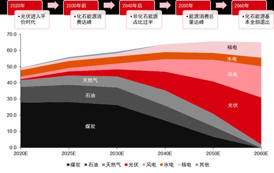 實現碳中和的堅定決心將深刻影響中國的能源結構、工業生產與消費方式。實現碳中和的關鍵,在于使占85%碳排放的化石能源實現向清潔能源的轉變。2020年非化石能源占比約為16.4%,預計2030年將達到26.0%,2060年接近100%。增量主要由光伏風電貢獻。