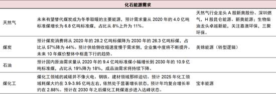 預計從2020-2030年,我國能源消費總量將增長20%;非化石能源是滿足這部分增量需求的關鍵,占一次能源比重將從16.4%上升到26.0%,其中光伏、風電潛力最大;化石能源占比將從83.6%下降至74.0%,其中煤炭、石油和天然氣消耗總量分別于2025年、2030年和2040年達峰。